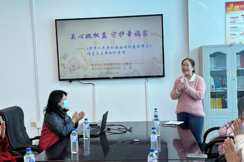 为庆祝“三八”国际妇女节,提升全体女性教职工的法制意识,丰富教职工的文化生活,3月8日上午,原子与分子物理研究所工会、妇委会联合举办了“关心她权益 守护幸福家”主题讲座暨妇女权益法律知识竞赛。活动由研究所妇委会主任陈怡主持,研究所全体女教职工参加了活动。
